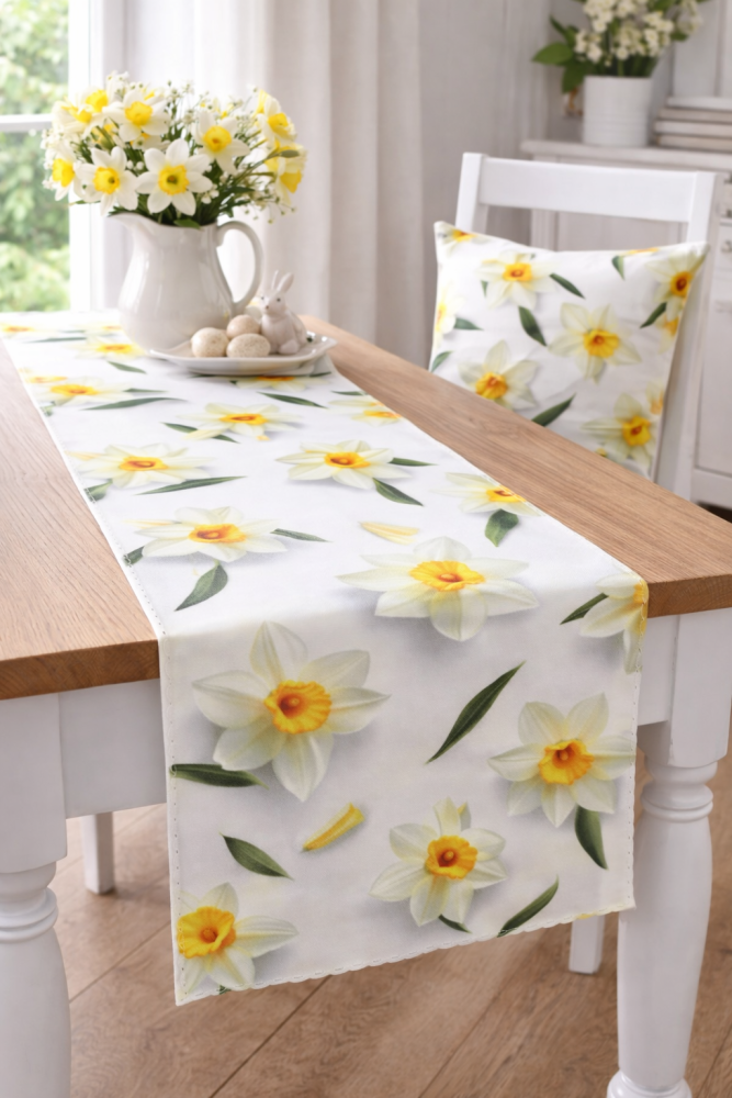 Když sladíte ubrus se závěsy a dekoračními polštářky, i obyčejná místnost se promění ve svěží jarní prostor, který vás naladí na sváteční pohodu.